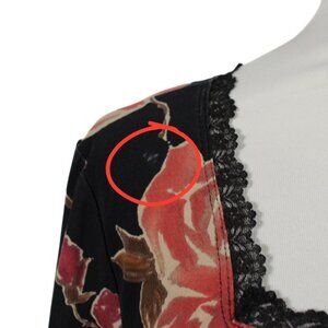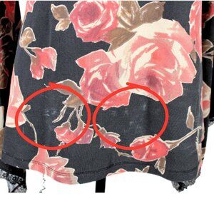 Vintage 1990s gothic whimsigoth rose print blouse with bell sleeves and black lace trim. Women's size large. Features stretchy fabric (88% polyester, 12% spandex), dramatic bell sleeves, and romantic floral pattern. Measurements (approx.):Sleeve: 22–29" (shortest to longest)Bell sleeve width: 11"Pit to pit: 19–24" (bust 38–48")Waist: 18–22" (36–44")Length (neck to hem): 26"Condition: Good/Fair with marks/stains on front chest neck collarbone neckline and on bottom (see images) has marks/discoloration under pits. Fading and pilling throughout. Great for gothic, witchy, or vintage-inspired outfits.