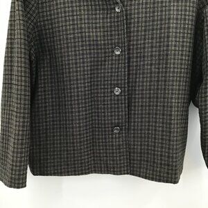 This is a vintage 1990s blazer in women's plus size 3X by Briggs. Given the button-up collar and boxy style I think this would also be a nice lightweight jacket for transitional weather, not just office wear. Color is olive green plaid, and it has an unusual woven texture. Fully lined, long sleeve, shoulder pads.