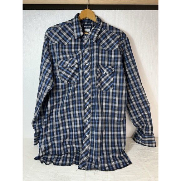 This is a vintage 1990s Wrangler long sleeve button-up shirt with a plaid pattern. It features pearl snap buttons and a multicolor design. The shirt is size LG with a chest size of 48 inches. It has accents with buttons and is suitable for casual occasions.