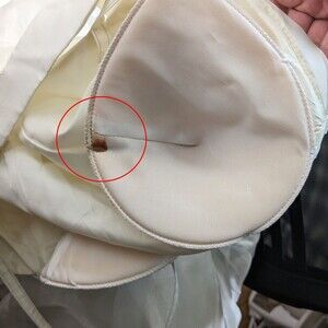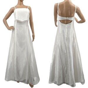 Vintage late 1990s, early 2000s (y2k) Aspeed white/ivory formal gown. Wedding/bridal. Maxi length. Beaded iridescent detail on bodice. Sleeveless. Sewn in bra cups. Sheer overlay with a slight sheen to material. Lined. Netting at skirt hem. Zip up back with button and clasp closure. Open back. Fairy/princess look. Dress is in good vintage condition with rust stain on inner bra cup. Not visible from outside. Zipper tab is broken with a white thread to pull zipper closed. Dress needs to be professionally steamed due to wrinkling. Please see photos.