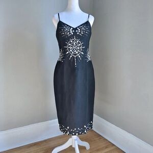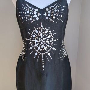 Vintage Sue Wong silk and linen blend dress. Late 90s/early 2000s. Sleeveless. Spaghetti straps. Floral beads made from shells. V-cut seaming at waist. Slit up back. Dress is in great vintage condition with loose seam at back slit. Please see last photo.