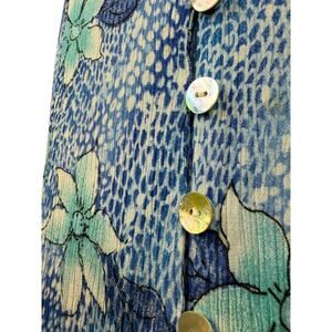 Vintage 1990's pure rayon DRESSBARN blue floral dress with crisscross back. 100% rayon. Mother of pearl buttons down front. Fun criss cross back. Small stain on front (see photo). Marked size 14.