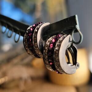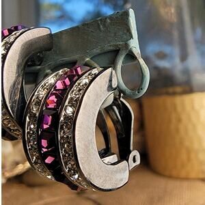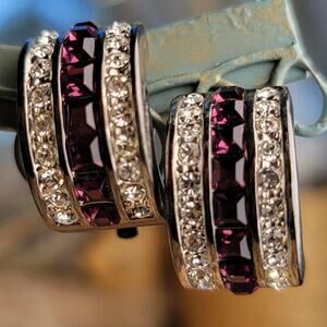 Vintage 1990s silver earrings, bold purple and clear crystal clip-ons