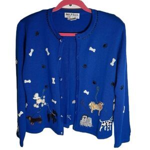 Vintage Jack B. Quick women’s size medium blue cardigan sweater with dogs, dog paws and bone embroidery made by Jack B. Quick.