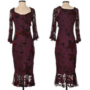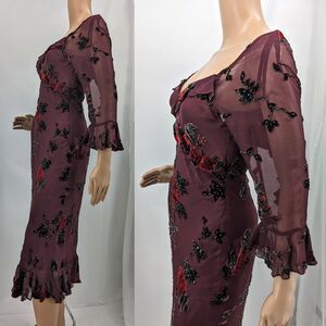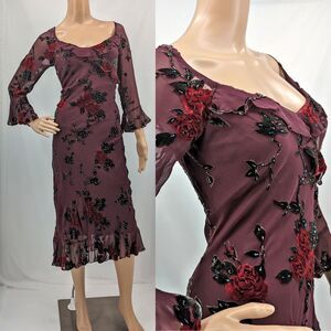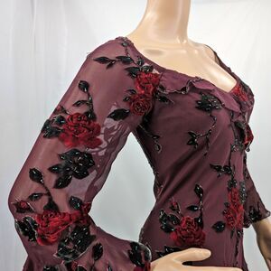Vintage late 1990s, early 2000s (y2k) Sue Wong midi dress. Maroon/burgundy. Semi-sheer overlay with floral velvet embellishments. Beaded detail. Lined. Ruffle at bust, cuffs and hem. Zip up side. Dress is in good vintage condition with small runs in sheer fabric on shoulders. This wear is very small. Please see photos.