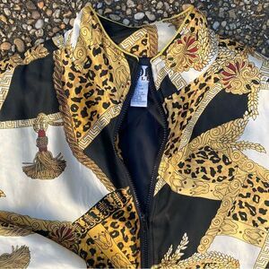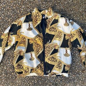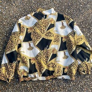 Classic 1990’s silk bomber jacket with animal print and gold tassel design. Very “Versace” and very 90’s. Condition is excellent.
