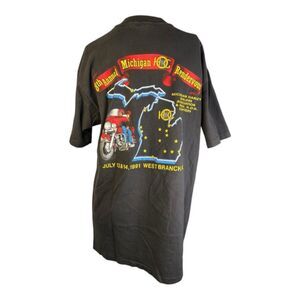 Original vintage 1991 Michigan Harley Owners Group (H.O.G.) Rendezvous t-shirt, held in West Branch, MI. This rare black tee features colorful front and back graphics of motorcycles, parachutes, and maps of Michigan. Signed on the front graphic (signature reads Gary G & Willie G 91). Classic biker collectible with strong graphic detail. Made in USA.