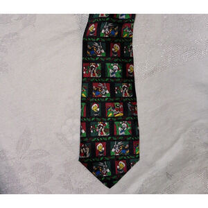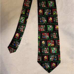 Vintage 1991 Looney Tunes Christmas silk tie featuring Bugs Bunny, Tweety, Sylvester, and more in fun holiday scenes. Festive novelty print with holly, red, and green color blocks. 100% silk, hand made in Korea, officially licensed Warner Bros. collector piece. Perfect for Christmas parties, quirky office wear, or Looney Tunes fans.