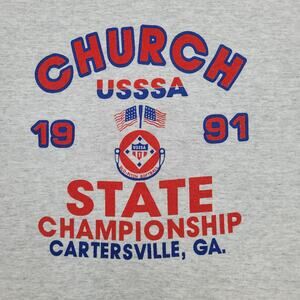 #Vintage1991, #USSSAChurchSoftball, #StateChampionship, #RussellAthletic, #SingleStitch, #WomensLarge, #RetroSportswear, #GrayTee, #SportsMemorabilia, #21x26Shirt