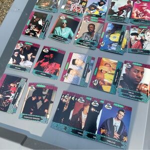 •These trading cards feature various hip-hop and rap artists from the early 90s, including popular figures like Public Enemy, LL Cool J, and Vanilla Ice, among others.