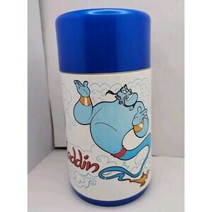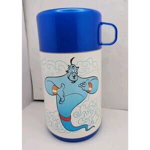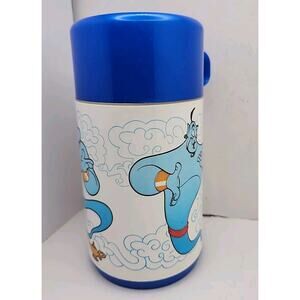 This is a vintage 1992 Disney Aladdin Genie 8 oz thermos with both lids, measuring 6.75" in blue retro color. The design features the beloved character from the Disney franchise, Genie.