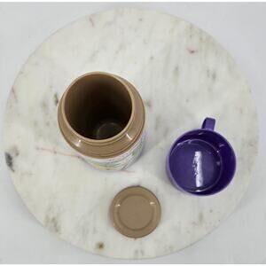 Nostalgia alert! This 1992 vintage Aladdin brand thermos features characters from Disney’s Aladdin including Jasmine, Rajah, and Aladdin himself flying through a magical Agrabah sky. The purple handled cup top screws off to reveal a tan twist-stopper. Great for collectors, themed décor, or actually using for small drinks on the go.