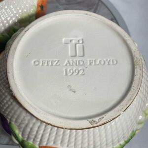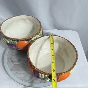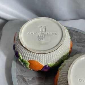 Brighten up your kitchen or collection with this charming set of two vintage Fitz and Floyd ceramic bowls from 1992. These bowls feature a vibrant hand-painted fruit garland design, with oranges, grapes, and leaves around a textured basketweave pattern.