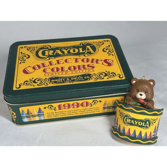 Vintage 1992 Hallmark Keepsake Christmas Ornament “Crayola Bear” & Tin Box 7"x5"
