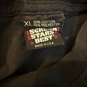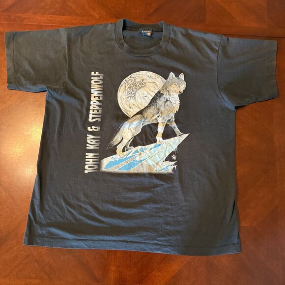 keywords: vintage band tee, John Kay, Steppenwolf, 1992 tour, wolf graphic, rock memorabilia, Screen Stars Best, collectible shirt, XL t-shirt, cotton polyester tee, black concert shirt, USA made, anniversary tour