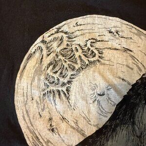 This vintage t-shirt commemorates the 25th anniversary tour of John Kay & Steppenwolf, featuring a striking wolf graphic. Crafted from a cotton and polyester blend, it offers comfort and durability. Ideal for collectors and fans, this piece showcases a unique design while reflecting the essence of classic rock memorabilia.
