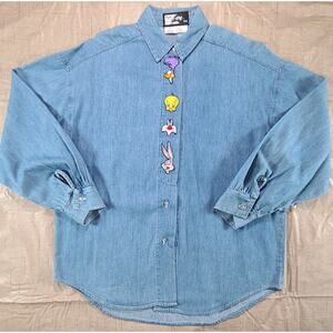 Vintage 1992 Looney Tunes Unisex Embroidered Button Down Denim Shirt Large