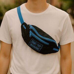 Step back into the 90s with this authentic vintage 1992 Olympic Games fanny pack, sponsored by Bausch & Lomb. This black nylon waist bag with bright blue zippers and adjustable strap is a true retro collector’s piece.