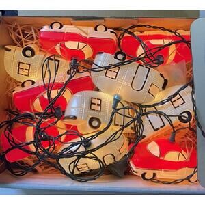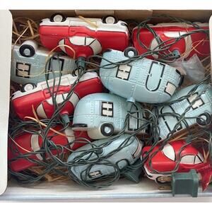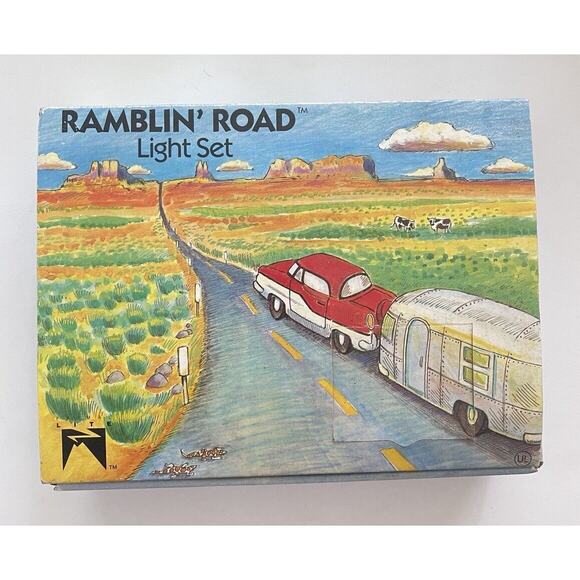 The Vintage 1992 Ramblin Road Light Set by Primal Lite is a string light that features 10 clear lights with a multicolor plastic cover in a vintage/retro style. It is corded electric and suitable for indoor and outdoor installation. The light set is tested and works perfectly. The design is inspired by travel and features retro cars and trailers. The product was manufactured in Taiwan by Sue Scott.
