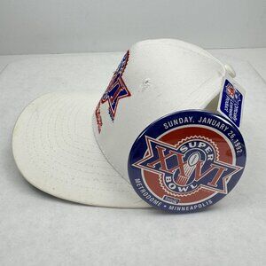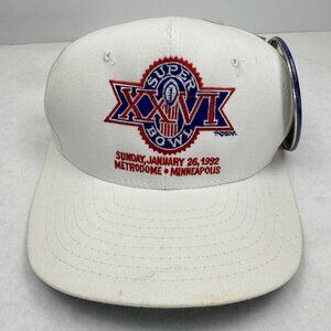 A vintage collectible snapback hat commemorating the Super Bowl XXVI held in 1992 at the Metrodome, Minneapolis. Official NFL Team product with embroidered details. Also included, matching collectible pin.