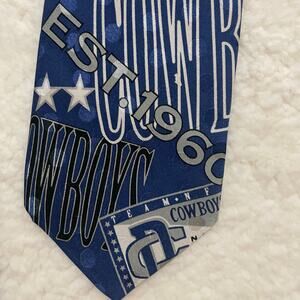 Show your Cowboys pride with this classic vintage necktie! A bold fan collectible featuring the Dallas Cowboys team logo, “EST. 1960,” and NFL graphics in blue, silver, and white. Perfect for game day, office wear, or adding to a Cowboys memorabilia collection.