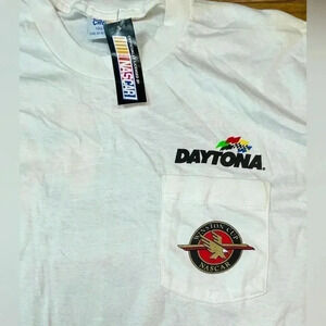 Daytona 500 Winston Cup, Nascar T-Shirt. Small front graphics and uber large back graphic. Colors are extremely vibrant. Inspection sticker still on front. 100% cotton with chest pocket, Cal-Cru tag, Nascar tag, Men’s XL