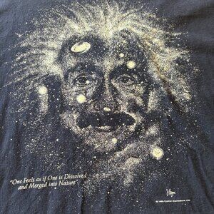 Super rare and collectible Vintage 1993 Einstein SPIE Tech Tee in black with a bold Einstein + galaxy graphic! From The International Society for Optical Engineers (SPIE) — a perfect tee for tech bros, science lovers, or anyone into rare STEM or single stitch vintage finds.