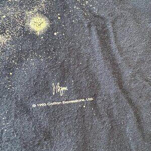 The tag is missing but fits like a roomy L/XL — check measurements (in pics) for the best fit. Slight glow-in-the-dark feature on the print adds a fun retro touch. Soft and perfectly broken-in vintage feel.