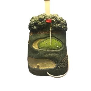 Add a touch of vintage charm to your home with this 1993 Figi Graphics desk lamp. The lamp features a unique golf design with a green ceramic finish. It has one light setting and is powered by corded electric. The lamp is a medium size and is suitable for indoor installation.