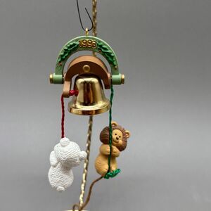 Vintage 1993 Hallmark ornament Curly n Kingly, featuring a lion and a lamb climbing ropes to ring a gold-tone bell. The ornament is fully functional, with movement when the cord is pulled. Includes the original box, which shows light storage wear and creasing. Ornament itself is in very good pre-owned condition with no major flaws.