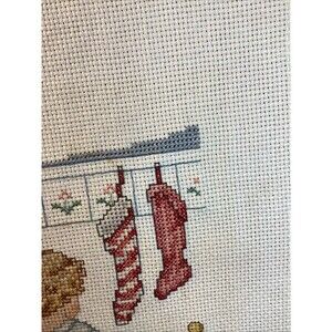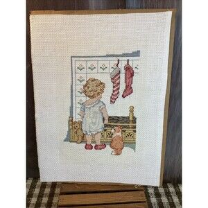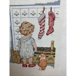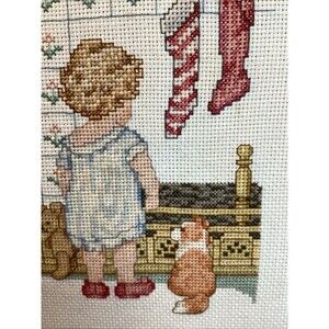 Vintage 1993 Handmade Needlepoint Cross Stitch Sampler Christmas Child & Puppy