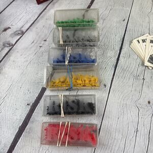 The Vintage 1993 Risk Board Game by GAME is a classic strategy game that involves world conquest. It can be played by a minimum of 2 players and is recommended for ages 10 and up. The game features a game board with a world map where players must strategically conquer territories to achieve world domination. With its timeless appeal and award-winning status, this board game provides hours of fun for both boys and girls alike. This game is missing 4 risk cards. One die is different. The rest seems to be complete.