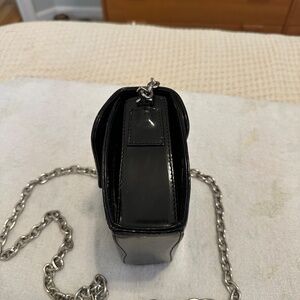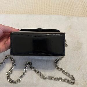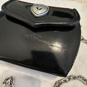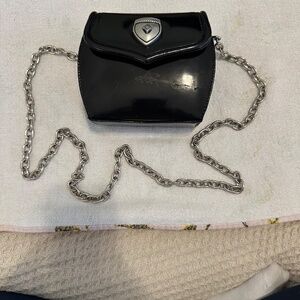 A sleek and collectible piece from Vincenza Inc. (1993), crafted in glossy black patent leather with a polished silver chain strap and matching shield-style clasp. The structured silhouette and deep green suede interior highlight the brand’s signature Italian craftsmanship and attention to detail. A rare vintage find that blends 1990s sophistication with a modern, minimalist edge. Excellent vintage condition. 6.5"h x 6/5"w x 4.5"d. Small damage on the front (see image)