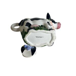 This whimsical cow-shaped ceramic teapot features a charming design with a blue bird and floral accents. Ideal for adding a playful touch to tea time.