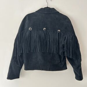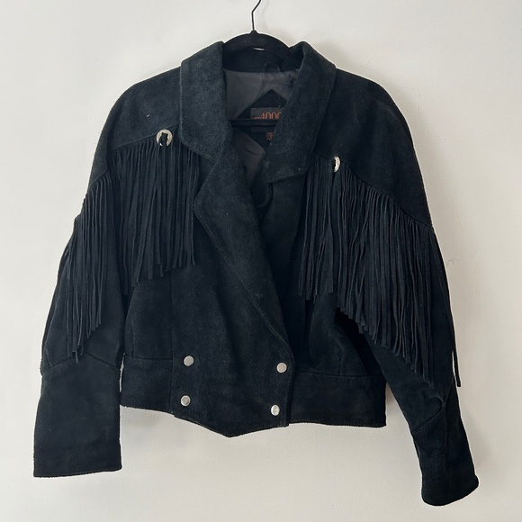 Vintage 1993 g4000 leather suede fringe jacket! Size small. There is a piece of the snap missing from the front snaps - photographed in photo 5. There is some wear/snag on the inner lining that you can see in the sixth photo. There is light wear on parts of the suede but overall in good condition. No rips, holes, stains, etc.
