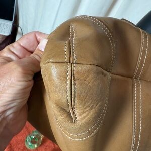 An outer pocket, two inside compartments, inside slip pockets and an inside zip pocket. The leather is well conditioned and buttery soft. Small pen mark as noted in pics. Made in 1994