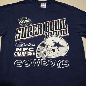 Vintage 1994 Dallas Cowboys Super Bowl XXVIII Champions Tee Shirt Size Large on a hanes heavyweight tag single stitch shows signs of wear has a small hole shown in pictures back of shirt under neck area sold as is see pictures for reference and measurements