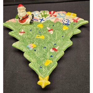 This is a vintage Fitz & Floyd plate in the shape of a Christmas tree with a 3d Santa sitting on the corner, holding a candy cane. There is a chip on the front side of the candy cane. There are a few areas with paint loss. Please review photos as a part of the description. 8.75" tall x 8" wide.