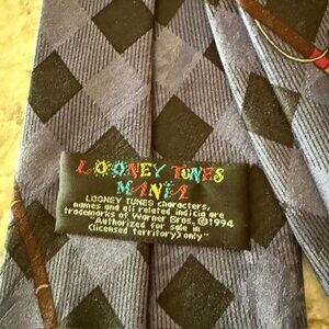 The Vintage 1994 Looney Tunes Taz Mania Character Tie featuring the character Taz is a unique and fun addition to any man's wardrobe. Made of polyester in a classic navy blue color, the tie showcases the iconic Taz character in an animal print pattern. With a pointed style and logo accents, this tie combines the nostalgia of Looney Tunes cartoons with the classic tie design, making it a whimsical and stylish accessory for any occasion. Made in the United States, this tie is a one-size-fits-most collectible piece for fans of vintage animation.