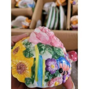 Spring Time Rabbit 21 Piece Tea Set Mercuries 1999. This adorable set is waiting to displayed. It includes a teapot, creamer, sugar, 4 tea cups and 4 napkin rings, 4 spoons, 4 plates It is in very nice pre-loved condition. I could not find any chips cracks or damage but this is a used item and I may have missed something small. (One chip which i found is listed in the last pic). These pieces are not dishwasher or microwave safe. The teapot is about 7" tall by 8 1/2" wide.