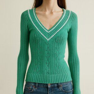 1994 Old Navy knit sweater in a classic Y2K preppy style. Featuring a deep V-neckline with sporty white trim, ribbed texture, and delicate eyelet knit details, this sweater is a perfect vintage find.