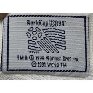 Get ready to show off your love for the Looney Tunes with this vintage 1994 World Cup USA soccer shirt. This size XL shirt features a solid white color with an embroidered design of your favorite Looney Tunes characters. The shirt is made of comfortable and durable cotton material, ensuring that it will last you for years to come.