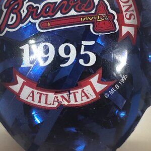 1995 World Campions Atlanta Braves Commemorative Glass Ornament, in original displayable box. The year is pronounced in White while the rest of the lettering is Red with White background/ rockers on a multi blue ~3" glass ball. This decoration is great for the Christmas Tree or just to put on the shelf to show your loyalty to the Braves. Great piece of memorabilia. Some scratching from being in storage, especially on the lower rocker that says "Atlanta" - please see pictures for condition details!