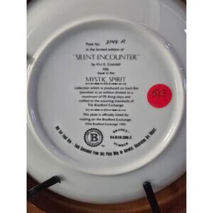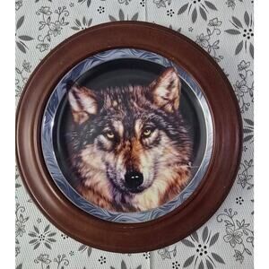 This vintage 1995 limited edition plate is the fifth issue in the Mystic Spirit collection by Vivi K. Crandall for The Bradford Exchange. Fine porcelain plate set in a wood display frame—striking wolf portrait with rich, crisp color.