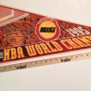 Calling all HOUSTON ROCKETS fans! Own a piece of sports history! This is a “like new” but vintage pennant from 1995 celebrating the NBA WORLD CHAMPIONS! Measures 30” x 12”…. Perfect for a man cave, sports area, bar, teen room… anywhere you like! Has the official hologram official license logo on back! Enjoy this great pennant!