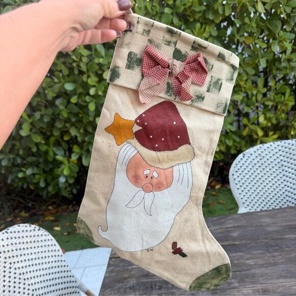 Vintage 1995 Hand Painted Signed Christmas Stocking Santa Fabric Bow Folk Art