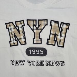 VINTAGE NEW YORK SHIRT, 1995 FASHION, RETRO STYLE, NEWSPAPER THEME SHIRT, MADE IN USA, MEDIUM FIT TEE, WHITE PLAID DESIGN, 90S CASUAL WEAR, CLASSIC STREETWEAR, RARE NYC COLLECTIBLE