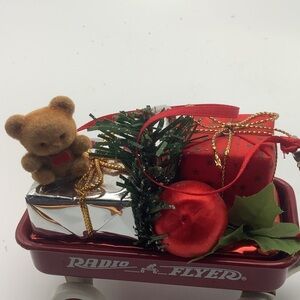 Cute vintage 1995 Christmas ornament featuring the Radio Flyer wagon filled with presents. The box is damaged. The teddy bear is loose from the present it sits on- see last photo.