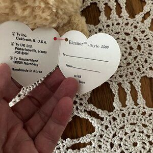 Hand tag and tush tag. Hang tag does have slight wear and the remains of sticker on the back. I do not have a tag protector big enough for this tag