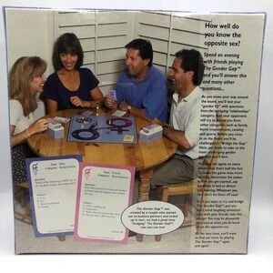 Vintage 1995 The Gender Gap Game NIB Sealed. The game is in a sealed box. Box size is 10.5 x 10.5 x 3.5 inches. Heavy. This game is an exhilarating adventure into the mind and thoughts of the opposite sex. On the right bottom corner there is a cosmetic scuff - see photo. Fun!